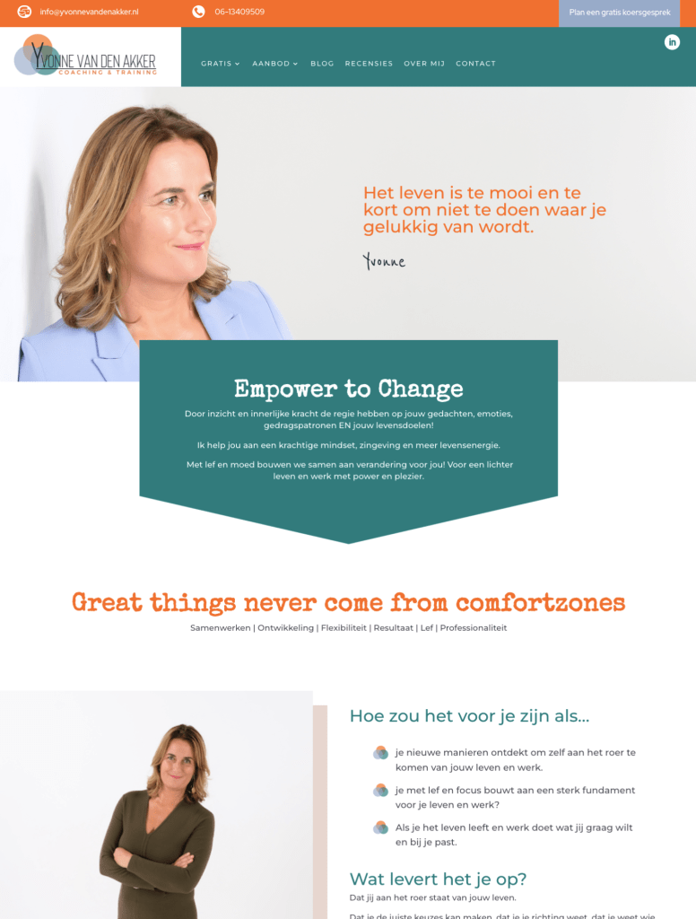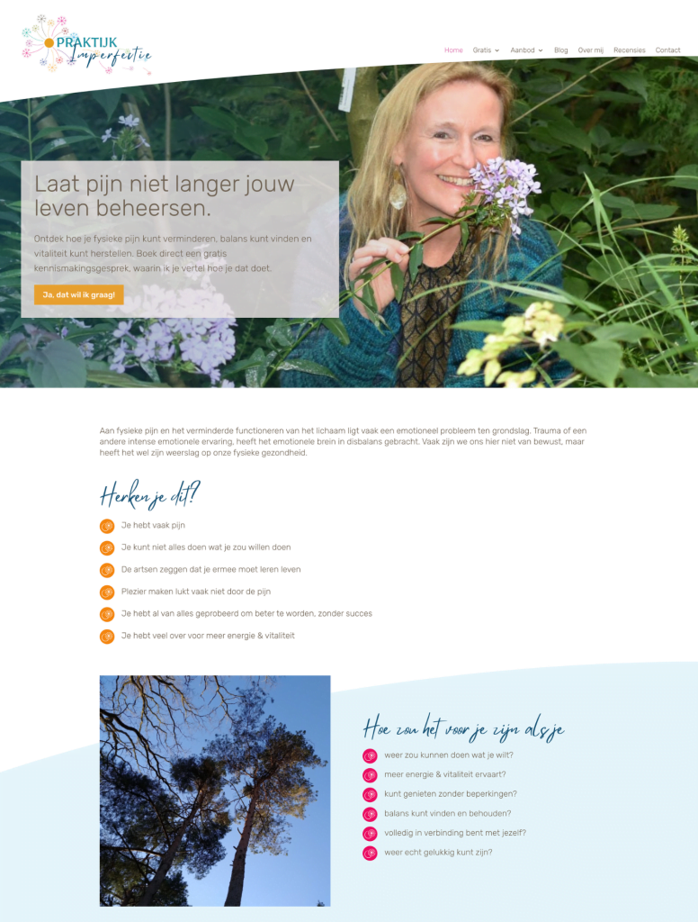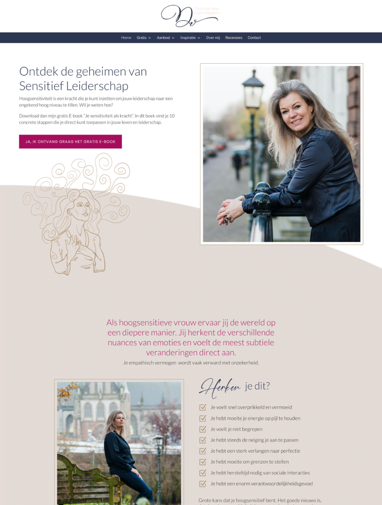 "Ik ben superblij met de website die Linda voor mij heeft gebouwd en vormgegeven. Op basis van mijn logo, teksten én ons gesprek wist zij precies wat ik wilde uitstralen. De mensen die mij kennen weten dat ik niet snel tevreden ben en vaak het e.e.a. kan aanpassen. Maar het eerste ontwerp dat Linda had gemaakt was wat betreft sfeer en stijl al direct raak! Ik was flabbergasted. Hier hoefde niets aan te veranderen! Dat gaf veel rust en vertrouwen.Linda is een warm persoon die je vertrouwen geeft. Ze voelt je goed aan, luistert met geduld, is vriendelijk, snel en denkt goed met je mee. Dat maakt het enorm prettig samenwerken met haar.Hoe fijn is het dan ook dat ik verder niet om hoef te kijken naar de backups en updates, omdat ik weet dat dit in goede handen is bij haar. "